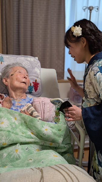 元美容師の入居者様は着付けを念入りにご覧になり、うれしそうに「とてもきれい」と絶賛されま