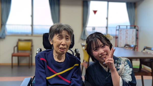 晴れ着姿を見た入居者様からは「かわいいわね~」「すてき!」「そうかそうか」「娘の成人式のことを思い出すわ」など次々にお声がかかり、見つめ合ううちに、入居者様も職員も胸がいっぱいになり、思わず涙ぐまれる場面もありました。